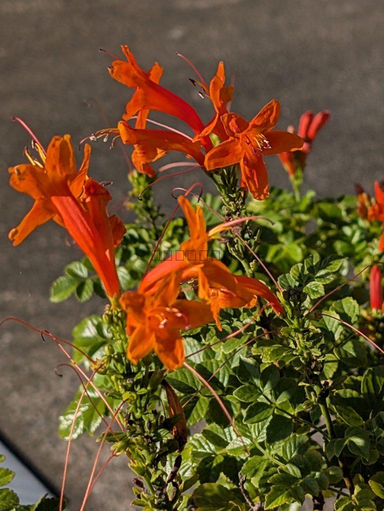 ヒメノウゼンカズラ(姫凌霄花)は、鮮やかな橙赤色の花を咲かせる、南アフリカ原産の半つる性の低木です。